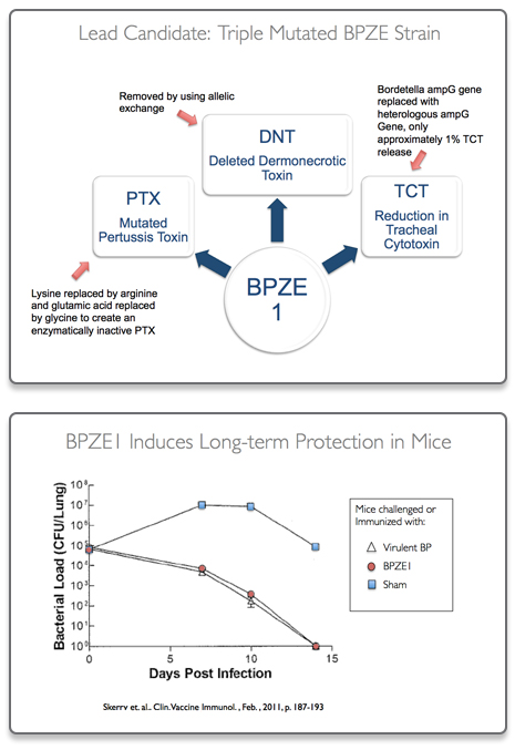 Over the past ten years, Dr Camille Locht has led the development of an attenuated vaccine strain based on knowledge of the specific molecular mechanisms of pertussis pathogenesis. The latest version of this vaccine strain, named BPZE1, contains genetic alterations that eliminate or inactivate three different B. pertussis toxins. In BPZE1 the dermonecrotic toxin gene is deleted, and the pertussis toxin (PT) gene is genetically modified by altering two different codons, so that the enzymatic ADP-riboslyltransferase activity of the toxin is abolished, yielding to a fully inactive protein. Finally, the B. pertussis ampG gene is replaced by E. coli ampG, which results in virtual absence of the tracheal cytotoxin.